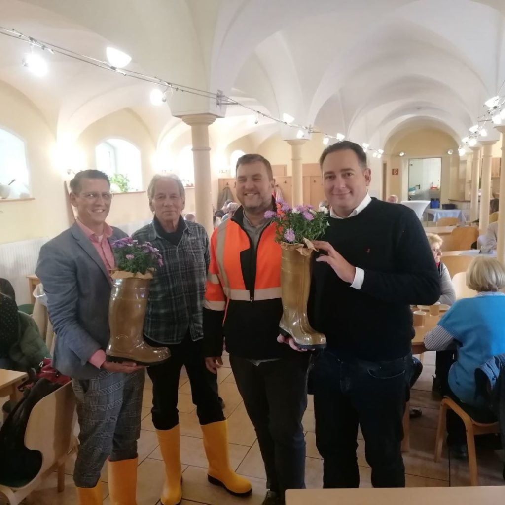 Die Idee der Gummistiefelparty, symbolisiert durch einen blumenbepflanzten, „vergoldeten“ Gummistiefel, kommt aus dem Rheinland, wo man am Rheinufer häufig in Gummistiefeln gemeinsam Überschwemmungsschäden zu Leibe rückt und dann zusammen feiert. Bei dieser 1. Geraer Gummistiefelparty waren übrigens auch alle Teilnehmer in der Gummifußbekleidung erschienen. Nicht schlecht an diesem Dauerregentag.
